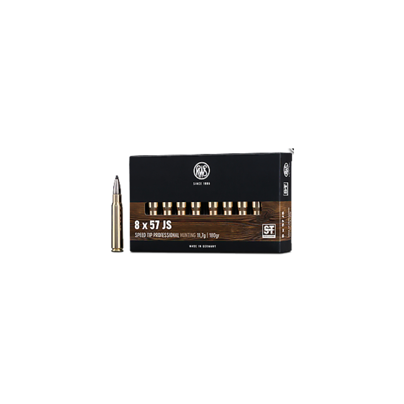 La munition RWS Speed Tip Pro 8×57 JS 11.7 g (180 gr) est une cartouche de chasse haut de gamme conçue pour le tir du grand gibier européen avec des carabines chambrées en calibre 8×57 JS, réputée pour sa précision, sa trajectoire tendue et son fort pouvoir d’arrêt. Fabriquée par la marque allemande RWS, elle utilise une balle de 11,7 grammes (180 grains) appelée Speed Tip Professional, caractérisée par une pointe polymère aérodynamique qui améliore la stabilité en vol et déclenche une expansion rapide à l’impact. La balle possède une conception interne sophistiquée avec deux noyaux en plomb de dureté différente séparés par une structure interne en forme de H héritée de la technologie RWS H Mantel bullet : le noyau avant, plus tendre, se déforme et se fragmente rapidement afin de créer un choc important dans les tissus, tandis que le noyau arrière, plus dur, conserve sa masse pour assurer une pénétration profonde et souvent une sortie de balle. La chemise nickelée réduit le frottement dans le canon et favorise une précision régulière, tandis que le culot profilé de type boat-tail améliore l’aérodynamisme et la stabilité sur les tirs à moyenne et longue distance. Dans ce calibre, la vitesse initiale se situe généralement autour de 800 à 870 m/s selon la longueur du canon, pour une énergie à la bouche proche de 3700 à 4050 joules, ce qui permet à la balle de conserver une énergie élevée jusqu’à environ 300 mètres. À l’impact, la pointe polymère est repoussée dans la cavité de la balle, provoquant l’ouverture rapide du noyau avant alors que la partie arrière poursuit sa course, ce qui combine expansion, pénétration et pouvoir d’arrêt élevé avec une bonne probabilité de sortie de balle et donc une piste de sang visible. Grâce à ces caractéristiques, cette munition est particulièrement adaptée à la chasse du sanglier, du cerf, du chevreuil, du chamois ou du mouflon, et elle est considérée comme une munition polyvalente capable d’être utilisée aussi bien en battue qu’à l’affût ou à l’approche, tout en restant efficace à courte, moyenne et relativement longue distance.